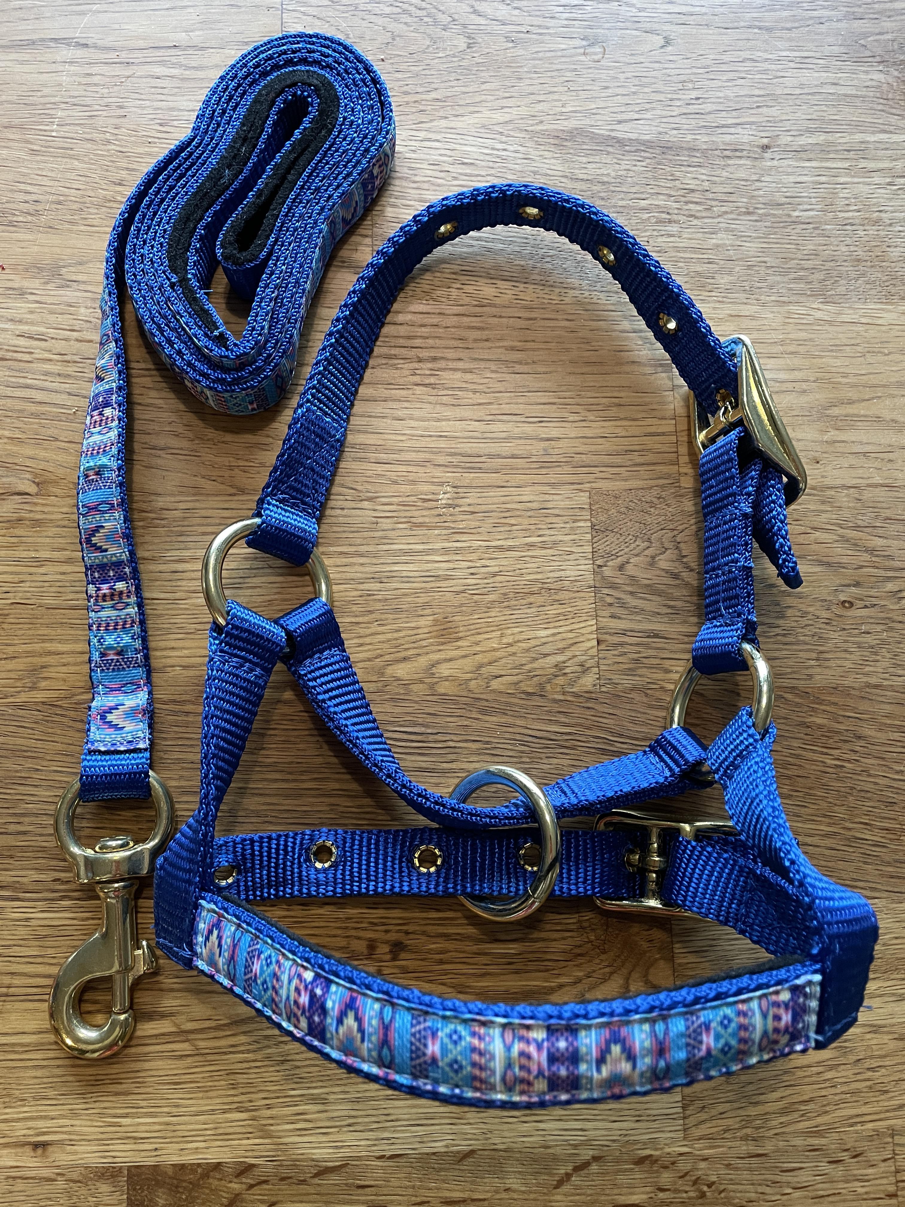 Ein wunderschönes Set für ein Lama oder auch für Ziegen Trekking. Eine passende Leine mit Handschlaufe ist auch weich unterlegt. Das Halfter ist 5fach an Genick und Nase zu verstellen.