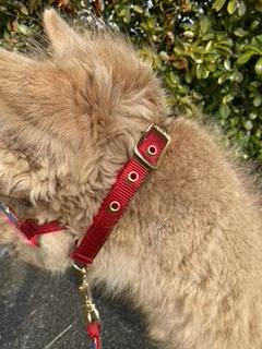 Unser Alpaka Hengst Petzi passt gut in dieses Lama Halfter. Es sind 5 Löcher zum Verstellen im Genick. Der Umfang für die Nase beträgt 41cm. Die Nase ist weich unterlegt.