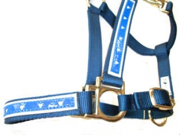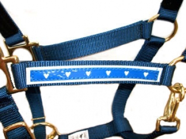 Dieses Halfter ist aus 3 Lagen Gurtband gefertigt, Nase und Genick kann verstellt werden und ist mit weichen Fleece unterlegt. Hellblaues Overlay mit Herzen, stabile Beschläge. Passende Stricke gibt es auch.